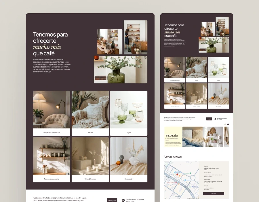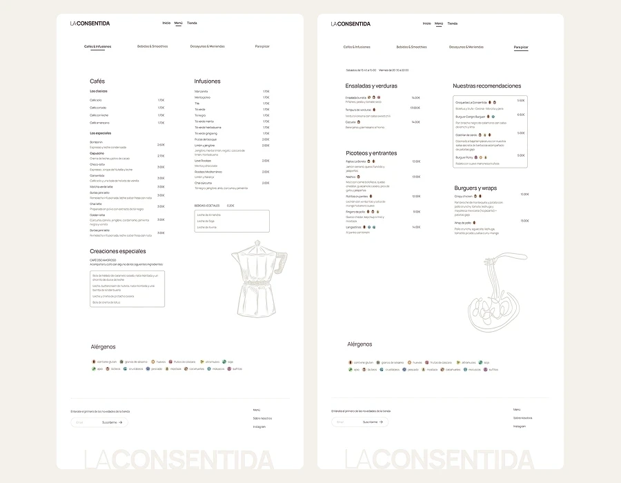 Además, se integró una sección dedicada a la tienda como escaparate visual, reforzando la identidad del negocio y mejorando la conversión. El menú se unificó con una estructura coherente, jerarquía clara de información y alérgenos visibles, reduciendo la carga cognitiva y haciendo la navegación más accesible y segura.