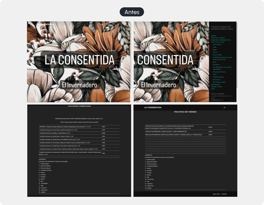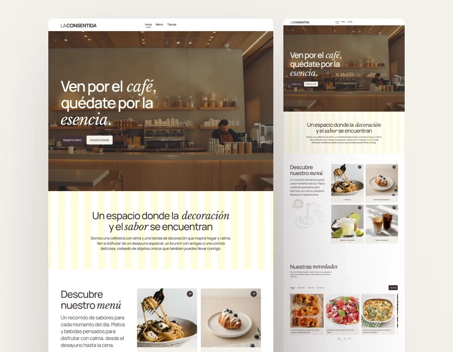 La Consentida es un negocio local híbrido, que ofrece una cafetería junto a una tienda de decoración. Sin embargo, su web original no reflejaba esta doble propuesta de valor. El sitio estaba centrado casi exclusivamente en la carta, con problemas de consistencia, jerarquía y accesibilidad, especialmente en aspectos críticos como la visibilidad de los alérgenos. Apenas mencionaba la tienda física ofreciendo una experiencia digital poco atractiva. Este proyecto nació para analizar la web existente mediante evaluación heurística y rediseñarla para ofrecer una experiencia más coherente, clara y segura, integrando en un solo espacio digital la esencia de la cafetería y la tienda.